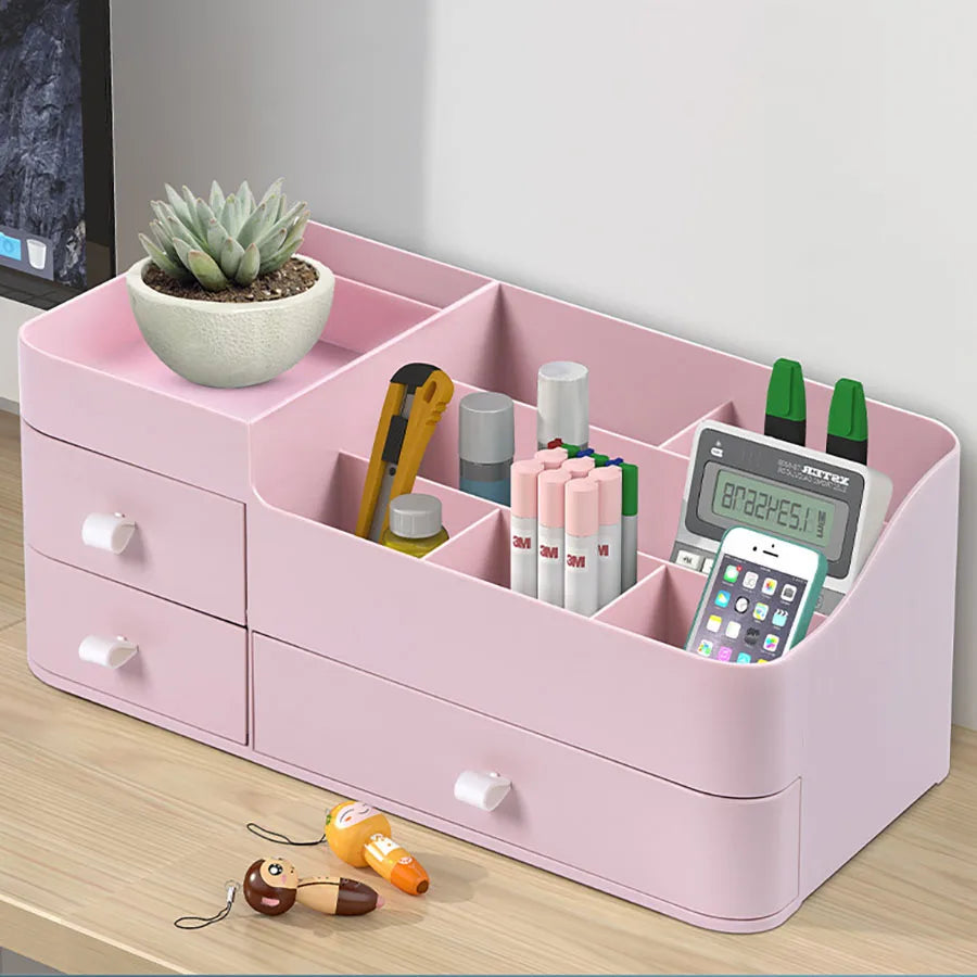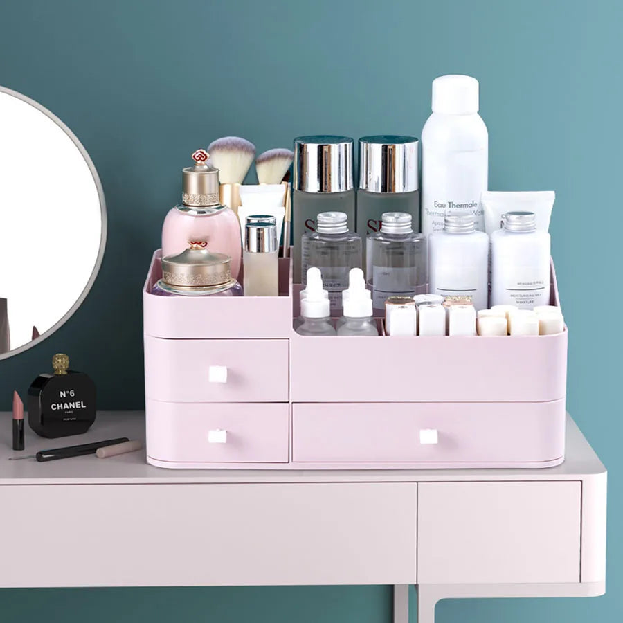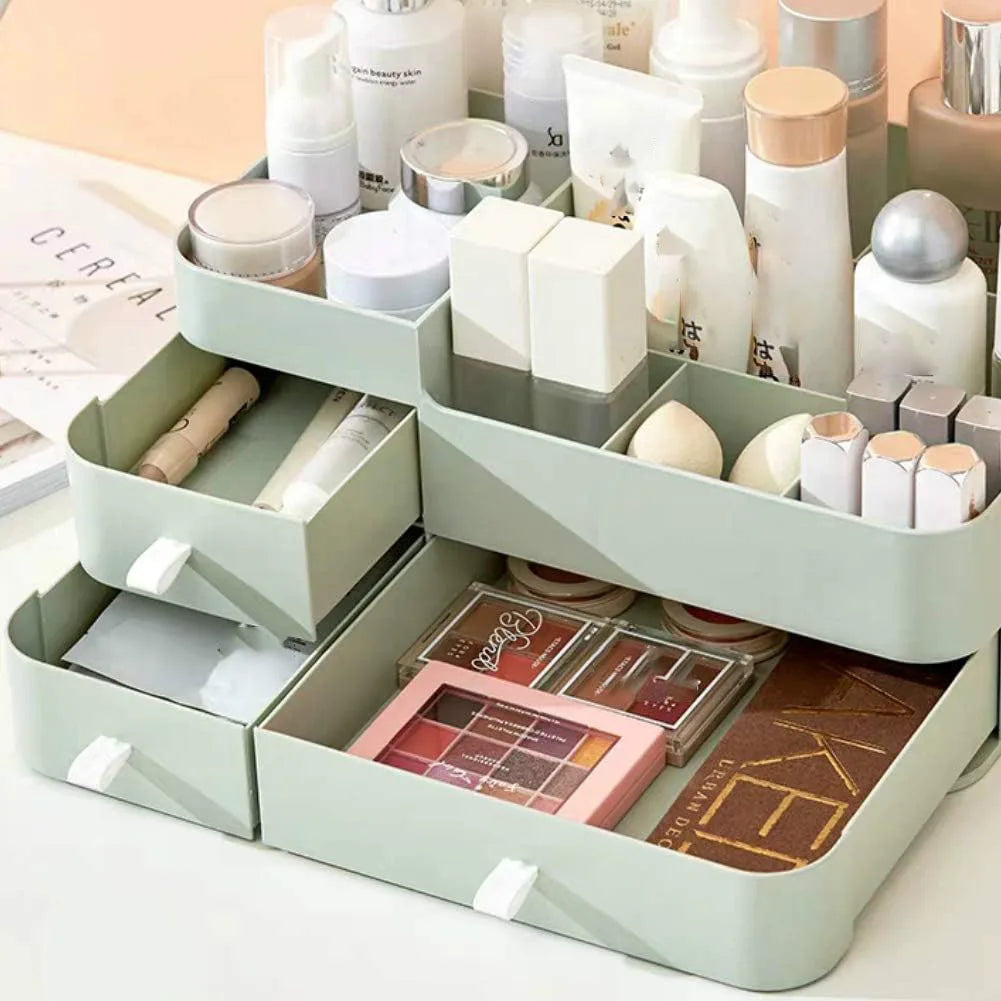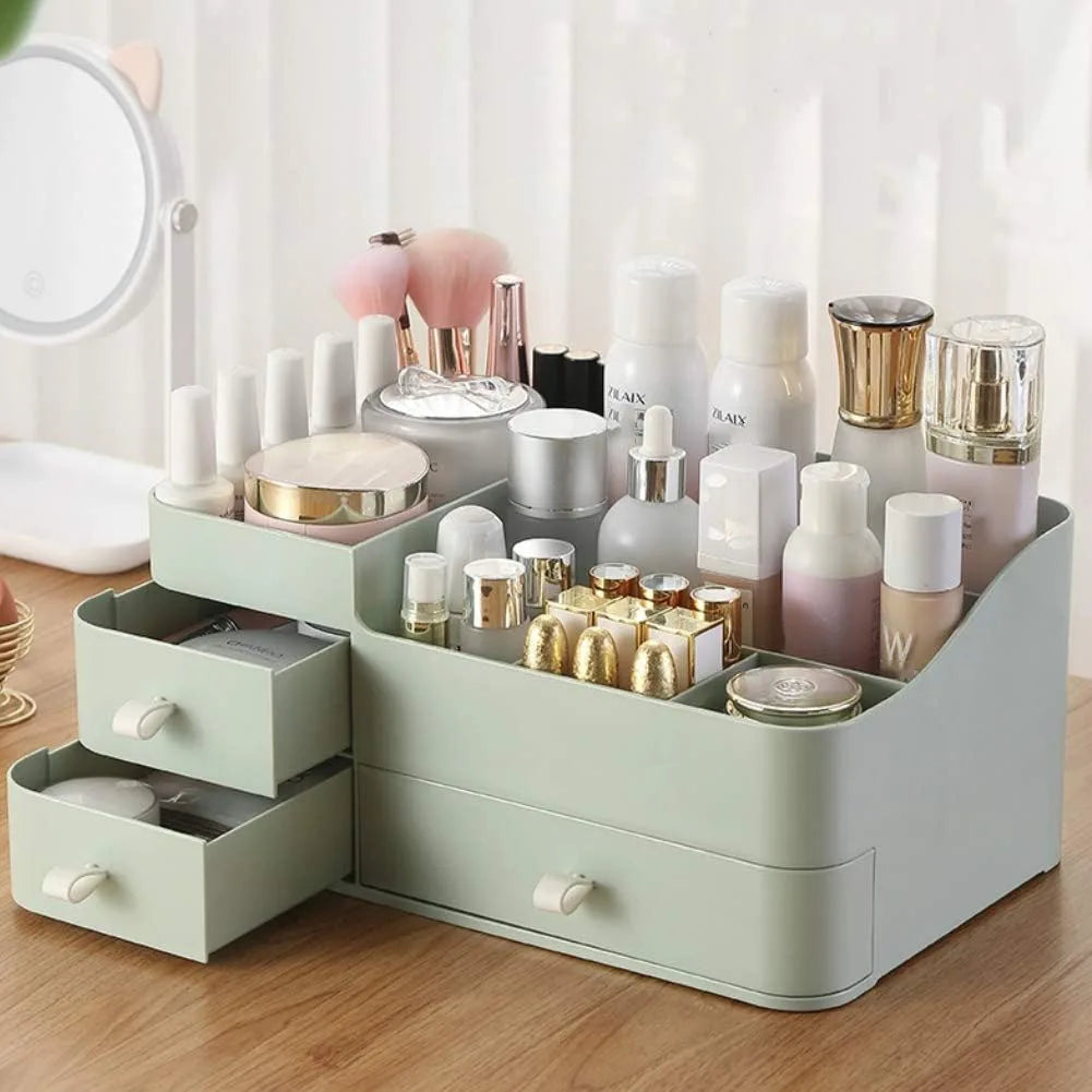 תיאור: קופסה שקופה עם מגירות או תאים שמונחת על שידת האיפור או השולחן.